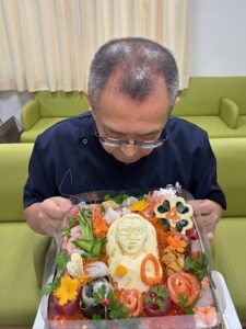 有難い、有難い。真ん中のサツマイモには私の顔が彫ってあり、ニンジンの聴診器まで作ってくれました。